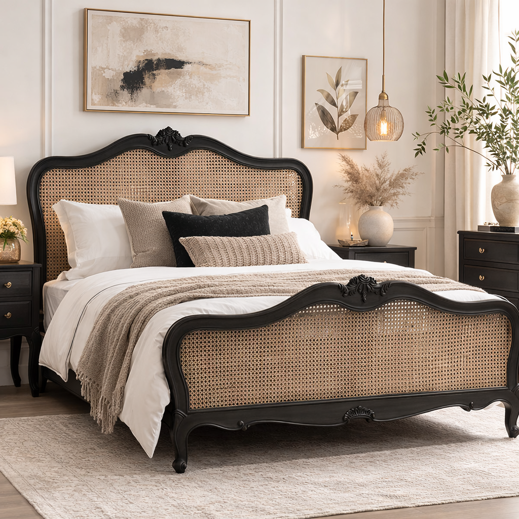 Bring timeless European elegance into your bedroom with the Éloria Cane Heritage Bed, a beautifully crafted piece inspired by classic French provincial design. Featuring gracefully curved silhouettes, delicate hand-carved detailing, and natural woven cane panels, this bed blends heritage craftsmanship with modern sophistication.